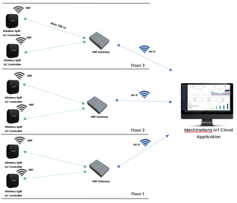 MachineSens IoT® ThermoSense NRF Split AC controller is a high-tech, plug-and-play intelligent device that offers centralized monitoring and management of heating and cooling system in offices, homes, and apartments. It is designed to work with a wide range of Split AC units.